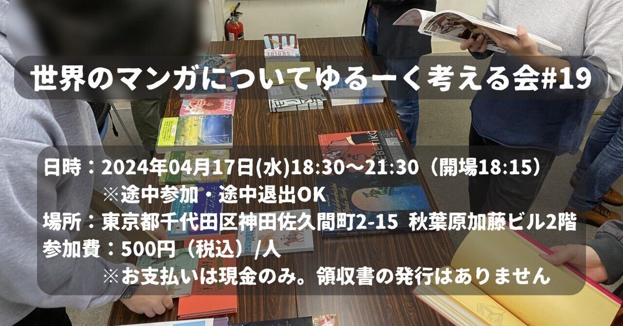また、不定期で、平柳さんと一緒に「世界のマンガについてゆるーく考える会」というイベントを開催しています。参加者の方々が持参してくれた海外マンガ(毎回多くの海外マンガが集まります)を眺めながらワイワイおしゃべりしたり、何か発表するネタがある人がいれば、その人の発表を聞いたり、という海外マンガ好きのためのイベントです。